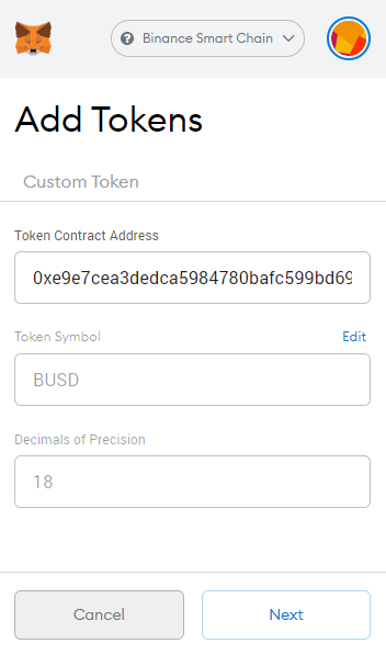 Step 2: Click on Add Token and then add 0xe9e7cea3dedca5984780bafc599bd69add087d56 as contract address. Now, everything else in the form will get automatically get filled. The token symbol will get automatically picked if it’s the popular one like BUSD.